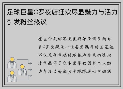 近年来,足球明星不仅在球场上展现出卓越的技艺和风采,他们在球场外的表现也同样引人注目。其中,抖腿舞成为了一种流行的潮流,吸引了大批粉丝的关注与模仿。本文将对这一现象进行深入探讨,分析足球明星抖腿舞所引发的热潮,以及这种舞蹈形式如何彰显他们在球场外的魅力与激情。文章将从四个方面进行详细阐述:一是抖腿舞的起源与发展;二是足球明星个人魅力的展现;三是社交媒体驱动下的文化传播;四是运动与艺术结合的新趋势。...
