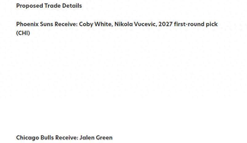 而尽管来到了太阳,但这位前火箭榜眼,似乎又有被卖的风险。媒体FW就支招太阳继续做交易,把杰伦-格林送去芝加哥,换来公牛两将科比-怀特和武切维奇,除此之外太阳还会拿到一个2027年的首轮签。